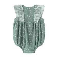 VESTIDO PARA NIÑA EN COLOR VERDE EMPOLVADO, CON LAZADA Y VOLANTE EN TIRANTAS DE RAYITAS, Y FLORECITAS BLANCAS EN TODO EL CUERPO DE LA PRENDA. ACOMPAÑADO DE BRAGUITA.