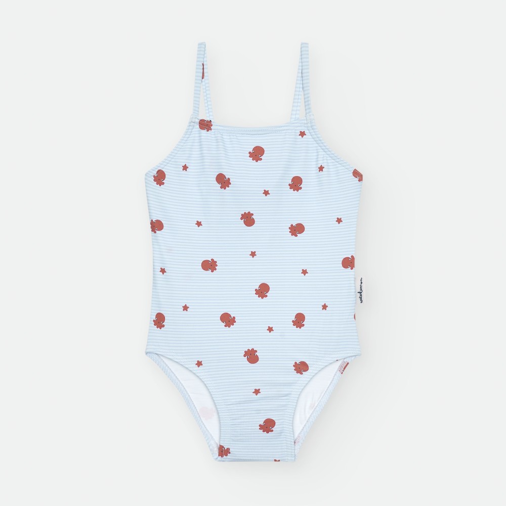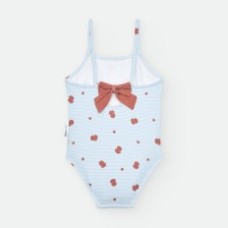 BAÑADOR DE LYCRA PARA NIÑA DE RAYAS CELESTES Y BLANCAS, CON ESTAMPADO DE PULPITOS Y ESTRELLAS ROJAS. DETALLE DE LAZADA EN LA ESPALDA.