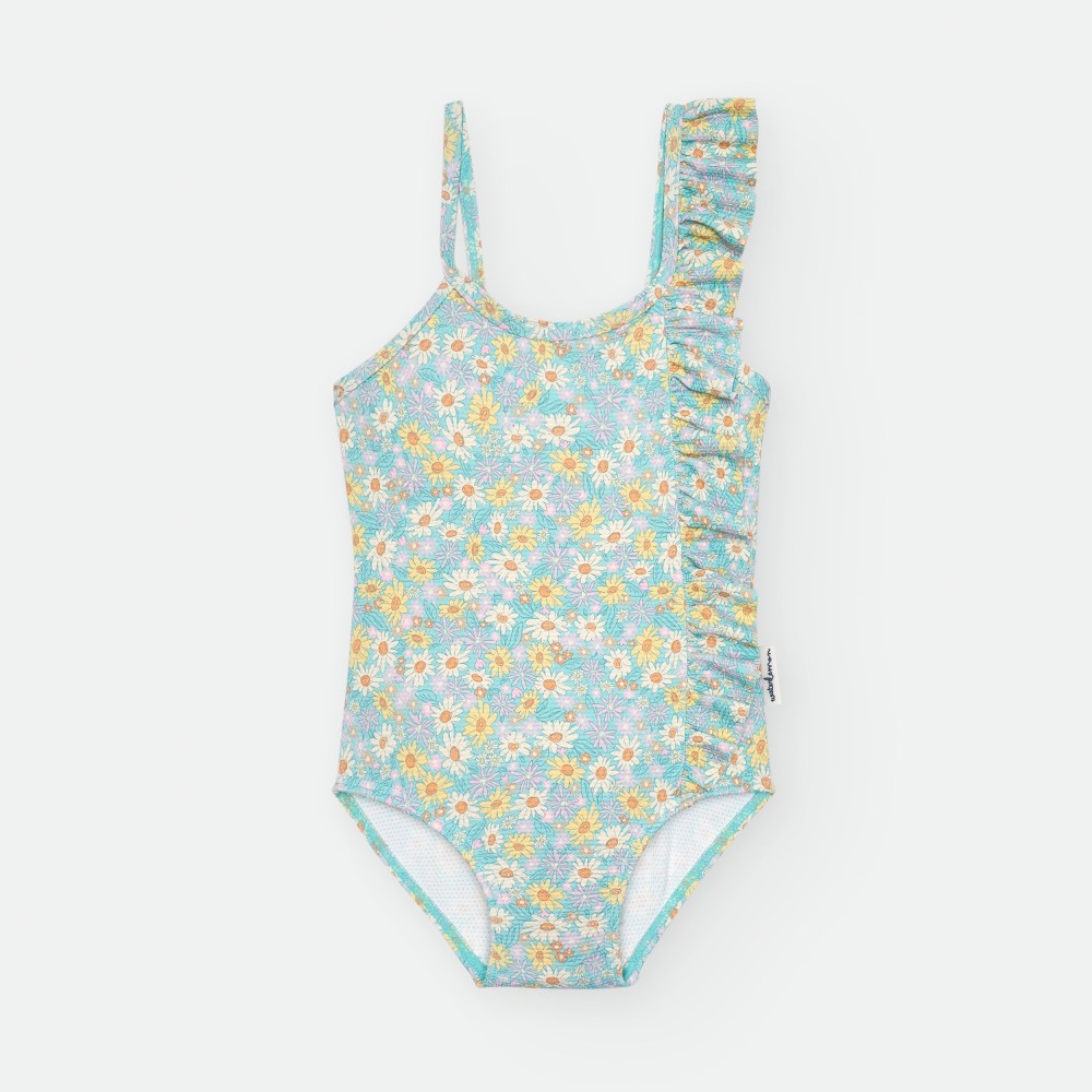 BAÑADOR DE LYCRA PARA NIÑA CON ESTAMPADO DE MARGARITAS BLANCAS Y AMARILLAS SOBRE FONDO TURQUESA.VOLANTE FRUNCIDO EN EL LATERAL FORMANDO UNA DE LAS TIRANTAS.