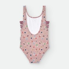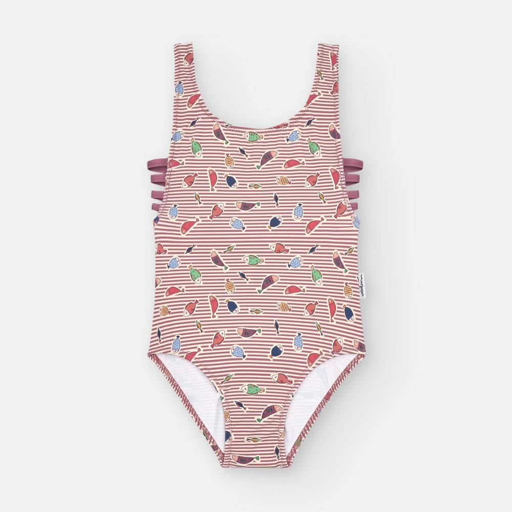 BAÑADOR DE LYCRA PARA NIÑA DE RAYAS GRANATE Y BLANCA, CON ESTAMPADO DE PECES MULTICOLOR.
