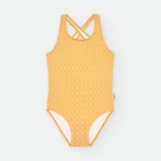BAÑADOR DE LYCRA PARA NIÑA CON ESTAMPADO GEOMÉTRICO SOBRE FONDO AMARILLO.