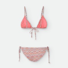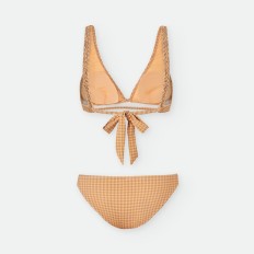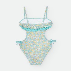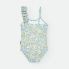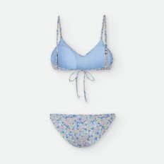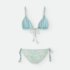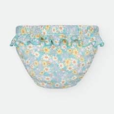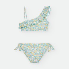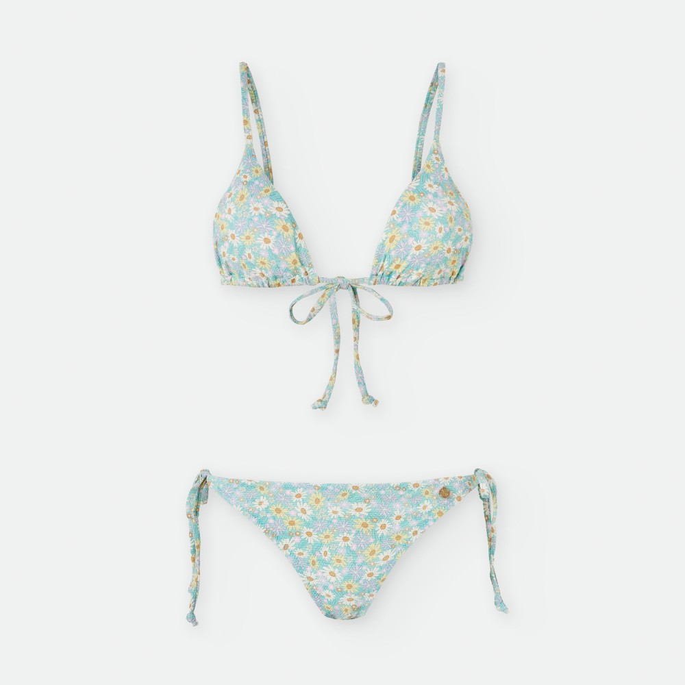 BIKINI JUVENIL PARA NIÑAS MAYORES O MUJERES CON ESTAMPADO DE MARGARITAS BLANCAS Y AMARILLAS SOBRE FONDO TURQUESA.