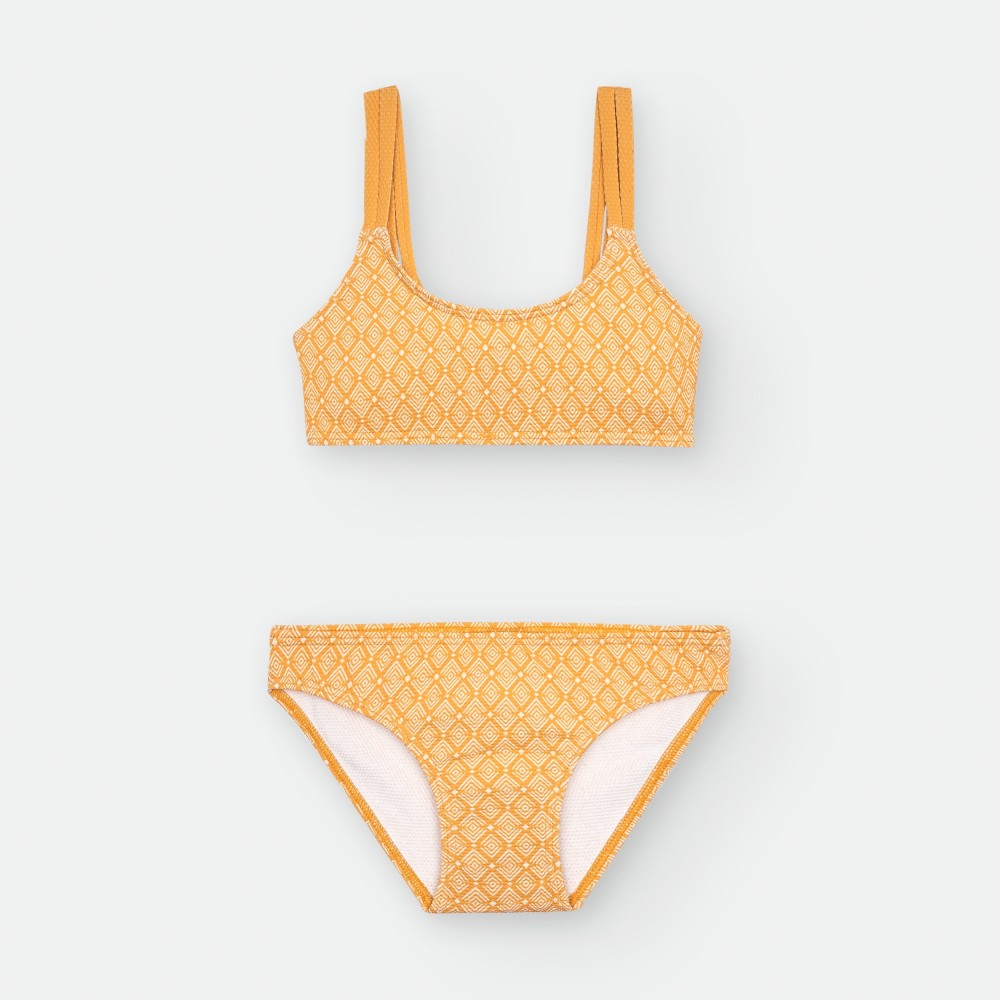 BIKINI DE LYCRA PARA NIÑA CON ESTAMPADO GEOMÉTRICO SOBRE FONDO AMARILLO.