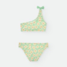 BIKINI DE LYCRA ASIMETRICO PARA NIÑA CON ESTAMPADO DE MARGARITAS SOBRE FONDO VERDE AGUAMARINA. DETALLE DE LAZADA EN EL HOMBRO.