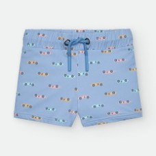 BAÑADOR BOXER DE LYCRA PARA NIÑO, CON ESTAMPADO DE COCHES DE FORMULA 1 EN VARIAS TONALIDADES SOBRE FONDO CELESTE.