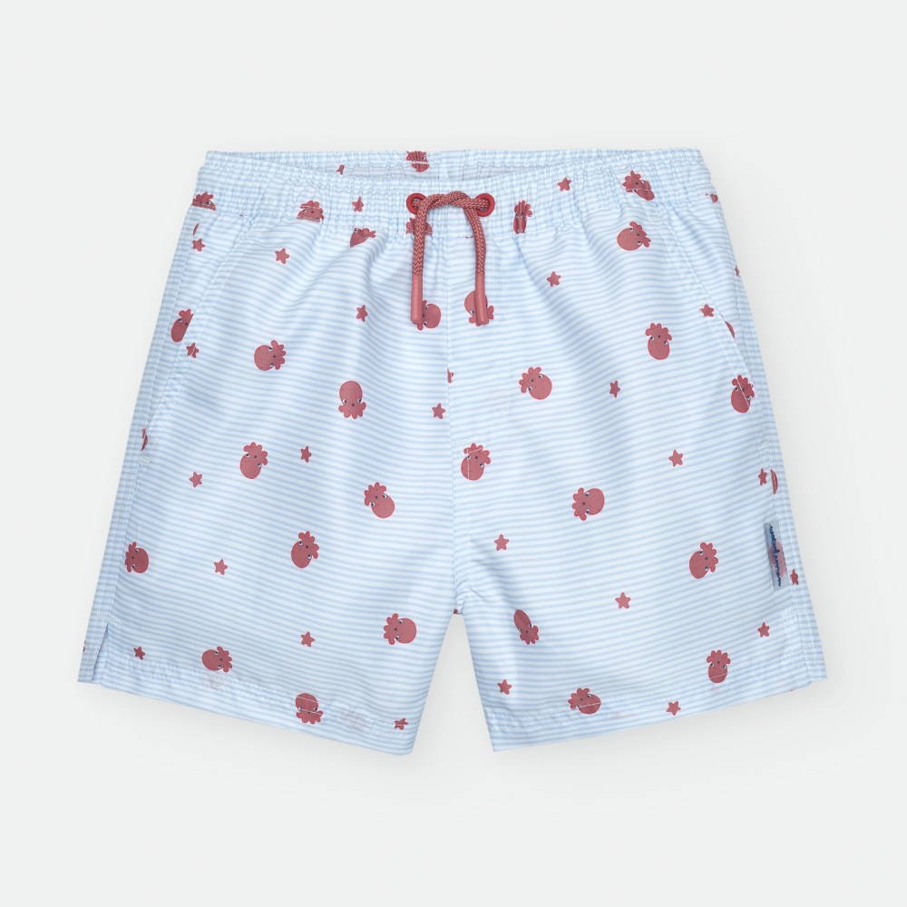 BAÑADOR DE TELA PARA NIÑO DE RAYAS CELESTES Y BLANCAS, CON ESTAMPADO DE PULPITOS Y ESTRELLAS ROJAS. CORDÓN AJUSTABLE EN CINTURA Y BOLSILLO EN LA PARTE TRASERA.