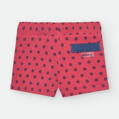 BAÑADOR DE TELA PARA NIÑO CON ESTAMPADO DE BARQUITOS DE PAPEL EN COLOR AZUL MARINO SOBRE FONDO ROJO. CORDÓN AJUSTABLE EN CINTURA Y BOLSILLO EN LA PARTE TRASERA.