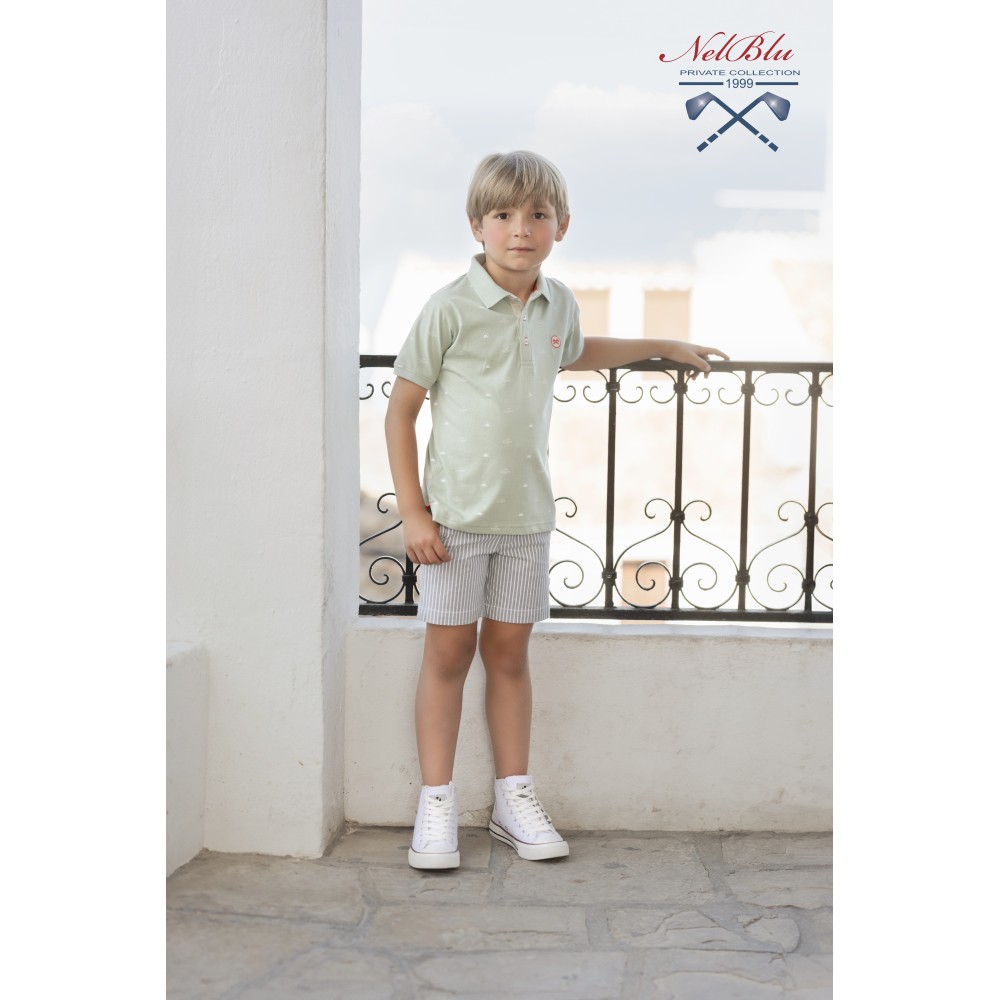 POLO DE ALGODÓN PARA NIÑO DE MANGA CORTA EN COLOR VERDE AGUA CON UN SUAVE ESTAMPADO DE SOLES Y OLAS EN COLOR BLANCO ROTO.