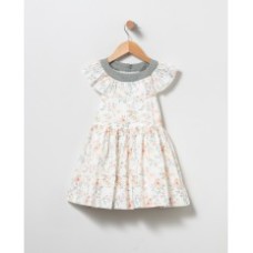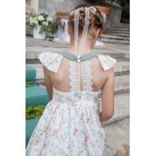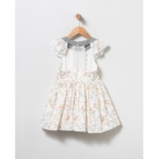 VESTIDO PARA NIÑA CON ESTAMPADO DE FLORES ANARANJADAS Y HOJAS VERDE KAKI. VOLANTE REDONDO SOBRE HOMBROS Y TIRAS DE ENCAJE EN LA ESPALDA.