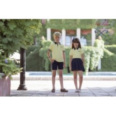 EL COLOR DEL POLO ES AMARILLO SUAVE COMBINADO CON EL CUELLO AZUL MARINO.