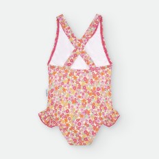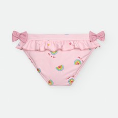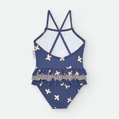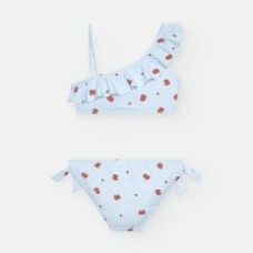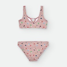 BIKINI DE LYCRA ASIMÉTRICO PARA NIÑA DE RAYAS CELESTES Y BLANCAS, CON ESTAMPADO DE PULPITOS Y ESTRELLAS ROJAS.