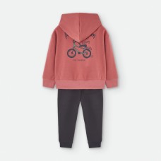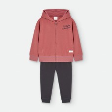 CONJUNTO DE FELPA FORMADO POR SUDADERA COLOR TEJA CON CAPUCHA Y CREMALLERA MÁS PANTALÓN GRIS OSCURO CON BOLSILLOS LATERALES DELANTEROS, UNO TRASERO Y PUÑO EN EL BAJO.