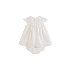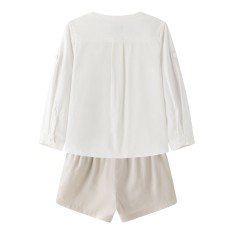 CONJUNTO DE VESTIR PARA NIÑO CON CAMISA CUELLO MAO EN COLOR BLANCO ROTO (CRUDO) Y PANTALÓN CORTO COLOR ARENA. CINTURA AJUSTABLE. TEJIDO 60% VISCOSA Y 40% LINO TRATADO DE ALGODÓN.