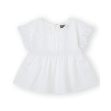 BLUSA BLANCA PARA NIÑA DE MANGA CORTA CON CORTE BAJO PECHO Y PEQUEÑO VOLANTE PERFORADO EN LOS HOMBROS.
