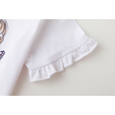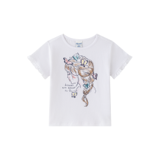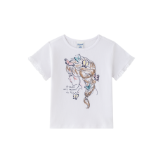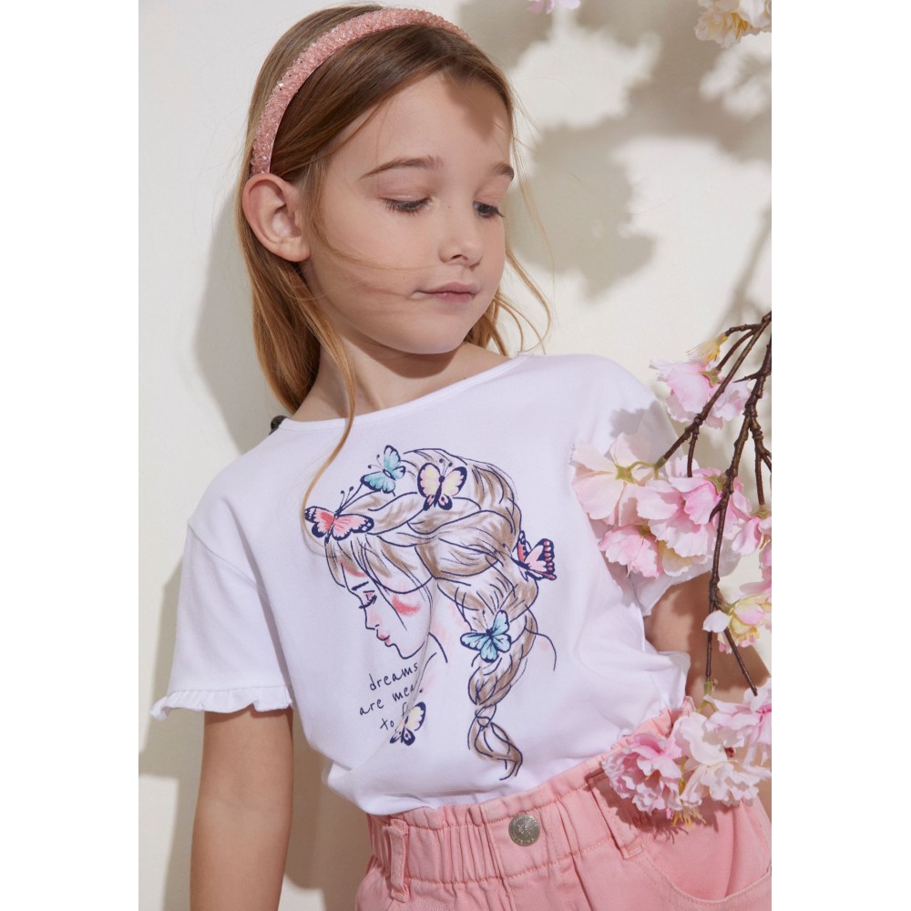 CAMISETA DE MANGA CORTA PARA NIÑA CON ESTAMPADO AL AGUA DE NIÑA CON TRENZA Y MARIPOSAS DE COLORES.