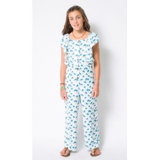 MONO PARA NIÑA DE TEJIDO FLUIDO CON FORRITO INTERIOR DE ALGODÓN HASTA LA RODILLA. VOLANTES A LO LARGO DE LOS HOMBROS Y HASTA EL CORTE DE LA CINTURA. ESTAMPADO DE PALMERAS EN COLOR AZUL PETRÓLEO SOBRE FONDO BLANCO.