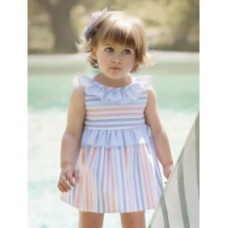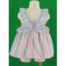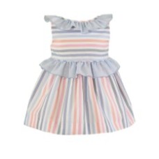 VESTIDO PARA BEBÉ DE RAYAS EN VARIAS TONALIDADES PASTELES, DETALLE DE VOLANTE CELESTE EN CUELLO, CINTURA Y ESPALDA.