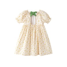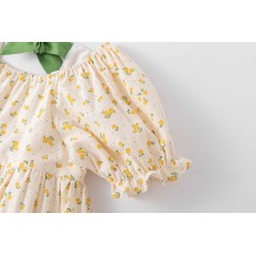 VESTIDO PARA NIÑA CON ESTAMPADO DE GIRASOLES. MANGAS CORTAS ELÁSTICAS. LAZO VERDE EN LA ESPALDA.