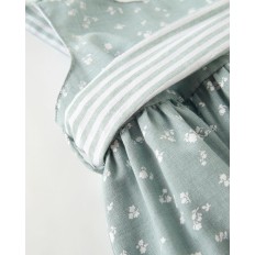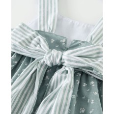 VESTIDO PARA NIÑA EN COLOR VERDE EMPOLVADO, CON LAZADA Y TIRANTAS DE RAYITAS, Y FLORECITAS BLANCAS EN TODO EL CUERPO DE LA PRENDA.