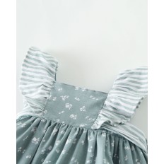 VESTIDO PARA NIÑA EN COLOR VERDE EMPOLVADO, CON LAZADA Y VOLANTE EN TIRANTAS DE RAYITAS, Y FLORECITAS BLANCAS EN TODO EL CUERPO DE LA PRENDA. ACOMPAÑADO DE BRAGUITA.